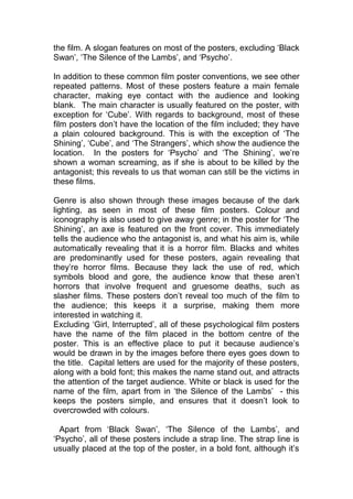 The document analyzes eight psychological horror film posters to identify shared conventions and repeated patterns, aiding in the creation of a new poster. Key features include dominant imagery, typical layout elements like title placement, and the use of color and iconography to convey genre. Most posters feature a main female character and minimal text, resulting in a simplistic design that captivates the audience's attention.