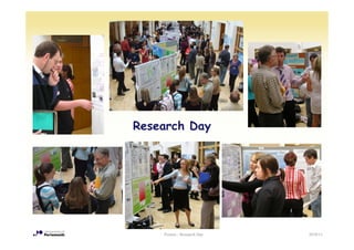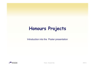 This document provides information about a research day poster presentation event. It discusses that the event will take place on March 30th from 10am to 3:30pm, where final year students will present their posters. It provides criteria for assessing the posters and tips for designing effective posters, including using clear structures, large fonts, and graphics. The document aims to help students prepare posters that concisely communicate their research.