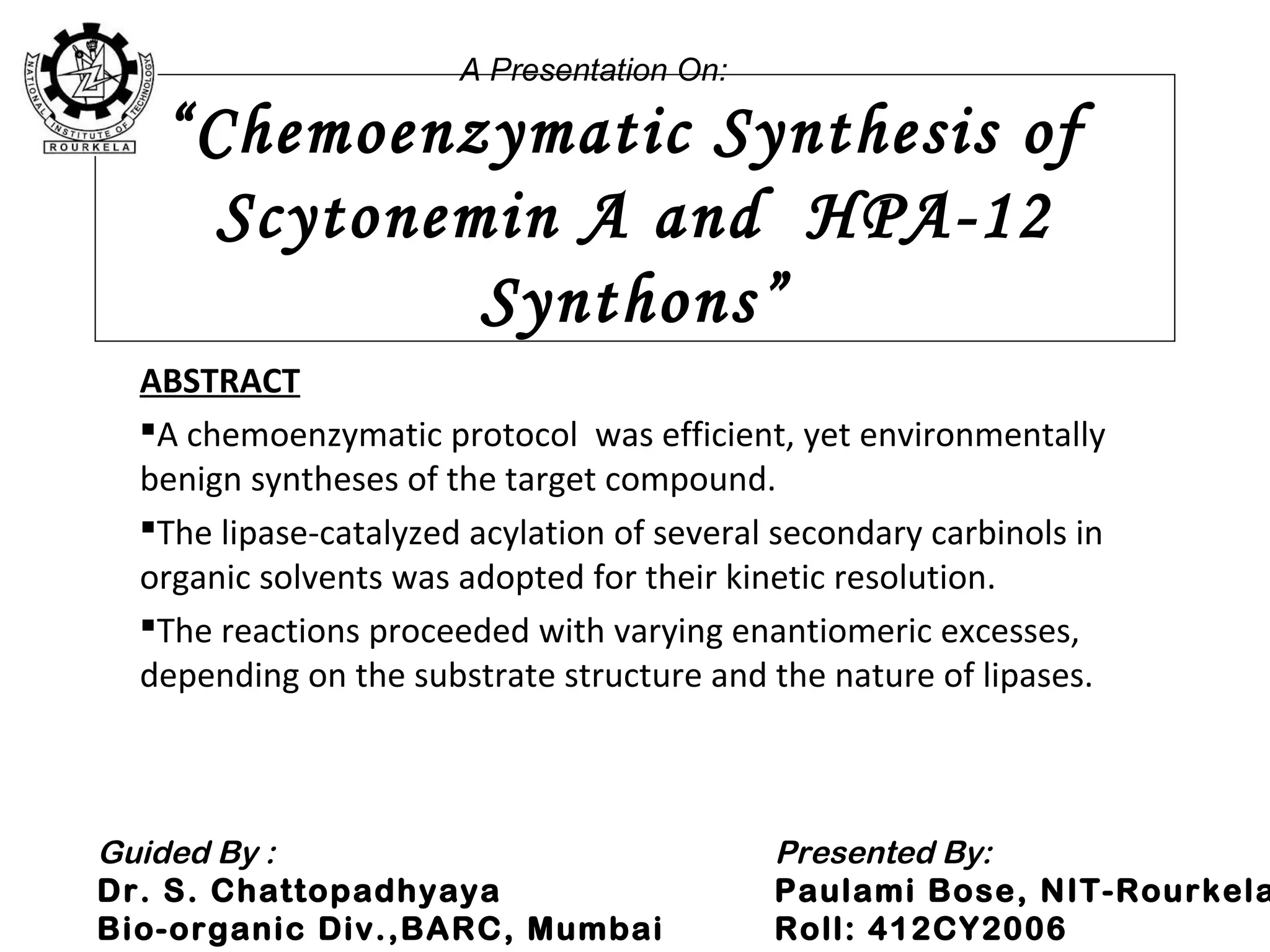 This document describes chemoenzymatic syntheses of segments of scytonemin A and HPA-12. Lipase-catalyzed kinetic resolutions were used to obtain enantiomerically pure secondary alcohols. Both (2R,6S)-13 and (2S,6S)-13 were obtained as precursors for scytonemin A synthesis. For HPA-12, alcohol dehydrogenase reaction of (S)-15 yielded (S)-17, the required precursor. Chemoenzymatic steps produced varying enantiomeric excesses depending on substrate structure and lipase used.