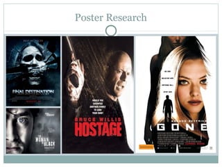 The document summarizes research on posters and websites for the horror-thriller films The Woman in Black, Hostage, and Final Destination. The posters all feature the main characters prominently to convey an unsettling situation. The Woman in Black poster shows Daniel Radcliffe's half-hidden face to emphasize hidden elements, while the Hostage poster uses Bruce Willis' lack of eye contact to imply something being hidden. Both films' websites match the eerie feel of the posters to help identify the genre, using clips, tabs, and promotional content to engage the audience.