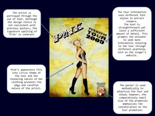 Posters are commonly used to promote upcoming music events and commercial products. They typically feature an image of the artist to help audiences recognize who the poster is related to. The design of posters is largely dependent on the artist's image and what they want to promote. Other factors like the target audience, poster location, information limits, and costs also influence the design.