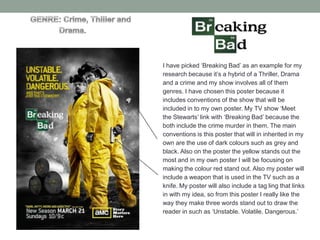Lara Roberts is researching posters for her TV show "Meet the Stewarts", which incorporates elements of thriller, drama, and crime genres. She analyzes posters for "Breaking Bad", "Sherlock", "Bates Motel", and "Boardchurch" to identify conventions to incorporate into her own poster. Specifically, she wants to use dark colors and make one color stand out like yellow in "Breaking Bad", feature a minimalist close-up of the protagonist's face with no emotion like "Sherlock", include a mysterious relationship and focus on one room like "Bates Motel", and depict crime-related conventions like detectives and police tape from "Boardchurch".