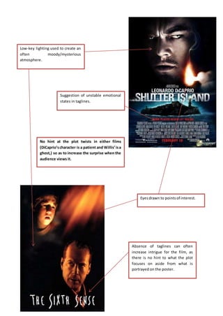 The document discusses techniques used in movie posters to promote films without revealing major plot details. Low-key lighting and points of interest are employed to set a moody tone, while ambiguous taglines and an absence of explicit plot references aim to pique intrigue and surprise viewers regarding twists like a character being a patient or ghost rather than stating it outright.