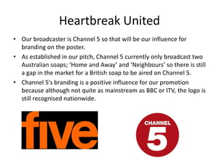 Edgar Walker is researching posters for a new soap opera called "Heartbreak United" that will air on Channel 5. The poster will prominently feature the Channel 5 branding to promote where viewers can find the show. As Channel 5 only airs two Australian soaps currently, there is space in their programming for a British soap. The Channel 5 logo is recognizable nationwide despite it not being as mainstream as BBC or ITV. Comparisons are made to poster designs of other shows, considering fonts, colors, hashtags and images to entice viewers while portraying the right tone of drama for the new soap.