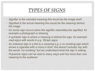 This document discusses types of signs and how they are used in film posters to convey meaning and messages to audiences. It defines signifier, signified, iconic, symbolic, and indexical signs. It then analyzes several film posters, discussing how elements like costumes, lighting, framing, colors and imagery are used semiotically to provide clues about the genre and plot. Specific techniques like faded faces, establishing shots, and placement of text and images are examined for their connotative effects in representing themes of death, loss, and the supernatural.