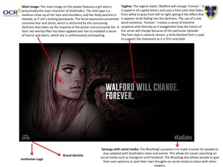 This document analyzes posters for the soap operas EastEnders and Hollyoaks. It discusses the taglines, main images, and use of social media on the posters. For the EastEnders poster, the tagline fades from white to gray and uses impactful one-word sentences. The main image shows a frightened female character in darkness. For Hollyoaks, the tagline and main image convey intensity through vocabulary and photo manipulation of characters on fire. Both posters effectively use hashtags to engage audiences on social media.