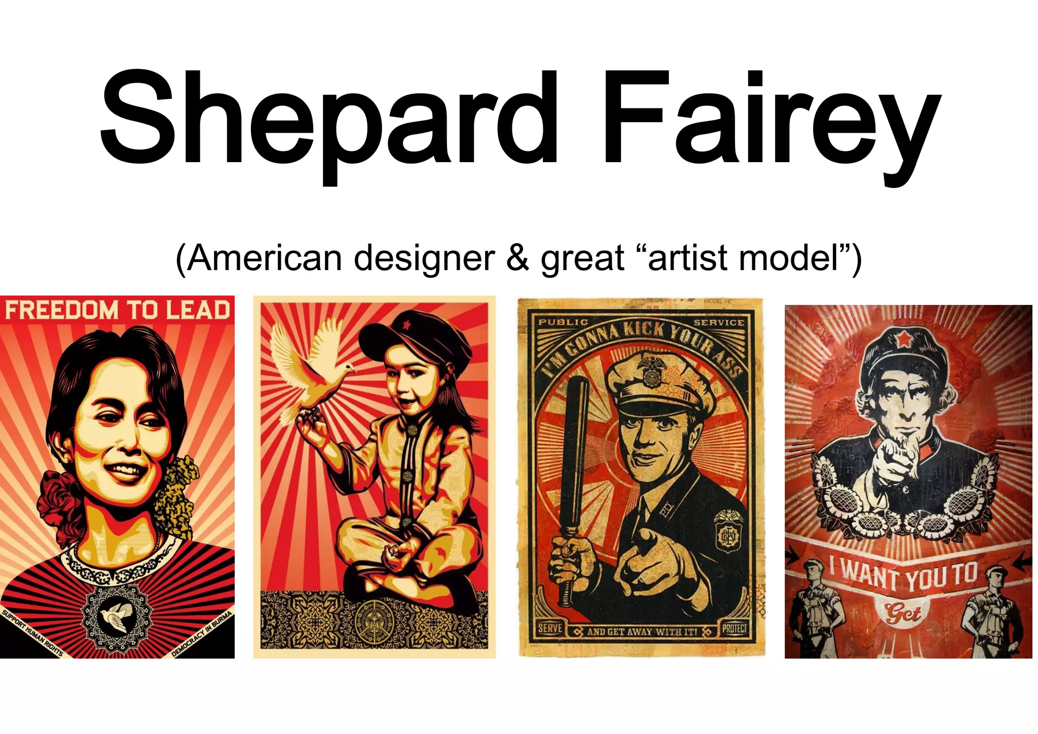 Shepard Fairey is an American graphic designer known for his iconic "Hope" poster of Barack Obama during the 2008 presidential campaign. He is considered a leading street artist and activist who uses graphic design and art to promote political and social messages. His provocative posters often feature appropriated images blended with bold, simple graphics and text to draw attention to causes of interest to Fairey.