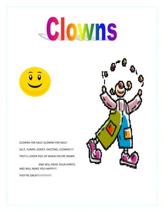 Clowns are for sale that are described as silly, funny, goofy and exciting to cheer people up when they are feeling down and raise their spirits to make them happy. The clowns are proclaimed to be great.