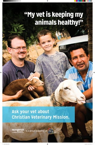 The document promotes supporting a veterinarian and Christian Veterinary Mission. It encourages asking your vet how to keep your animals healthy and learn more about Christian Veterinary Mission. In a few short words and images, it conveys caring for pets and supporting veterinary care through a Christian organization.