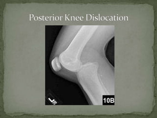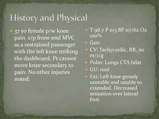 A 37-year-old female presented with left knee pain after being in a motor vehicle collision where her knee struck the dashboard. On examination, her left knee was grossly unstable and unable to extend with decreased sensation over the lateral foot. She likely suffered a posterior knee dislocation with injuries to both cruciate ligaments, the popliteal artery, and nerves. Treatment requires reduction, immobilization, assessment of vascular injury such as with CT angiography, and emergent orthopedic referral.