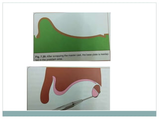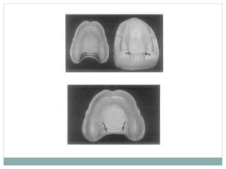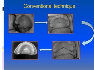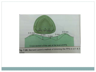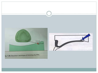 This document discusses the posterior palatal seal (PPS), which is an important area for providing retention of maxillary dentures. It defines the PPS as the area of soft tissue on the soft palate that can withstand controlled pressure from a denture. The document covers the anatomy and muscles of the soft palate, classification of soft palate shapes, landmarks related to the PPS, and techniques for recording the PPS during the impression process such as the conventional technique.