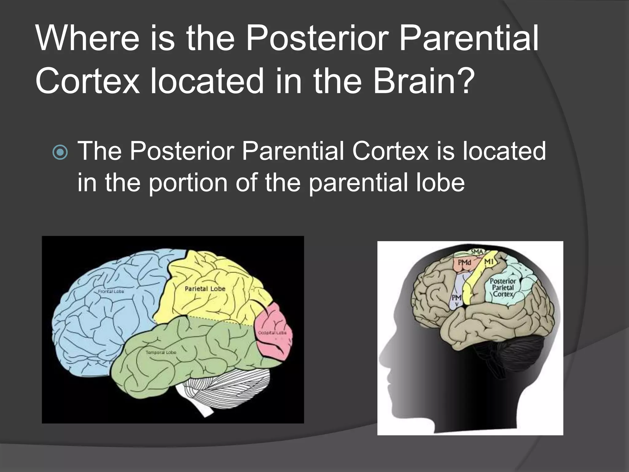 The Posterior Parietal Cortex (PPC) is located in the parietal lobe of the brain. It is involved in sensing and monitoring body parts as well as integrating information from different sensory areas. Studies have shown that lesions to the PPC in rats did not disrupt their ability to avoid certain areas in a maze. Other research found that the PPC encodes motor plans for eye or hand movements autonomously selected by monkeys. Transcranial magnetic stimulation over the left PPC was found to prolong the latency of contralateral saccades and convergence eye movements. Damage to the PPC can lead to apraxia, where patients have difficulty performing gestures or using objects on command despite understanding their functions.