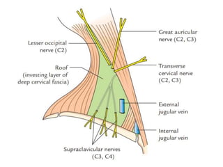3. The posterior triangle is divided into an upper occipital triangle and lower subclavian triangle by the omohyoid muscle. Structures in each triangle and potential spaces are described.