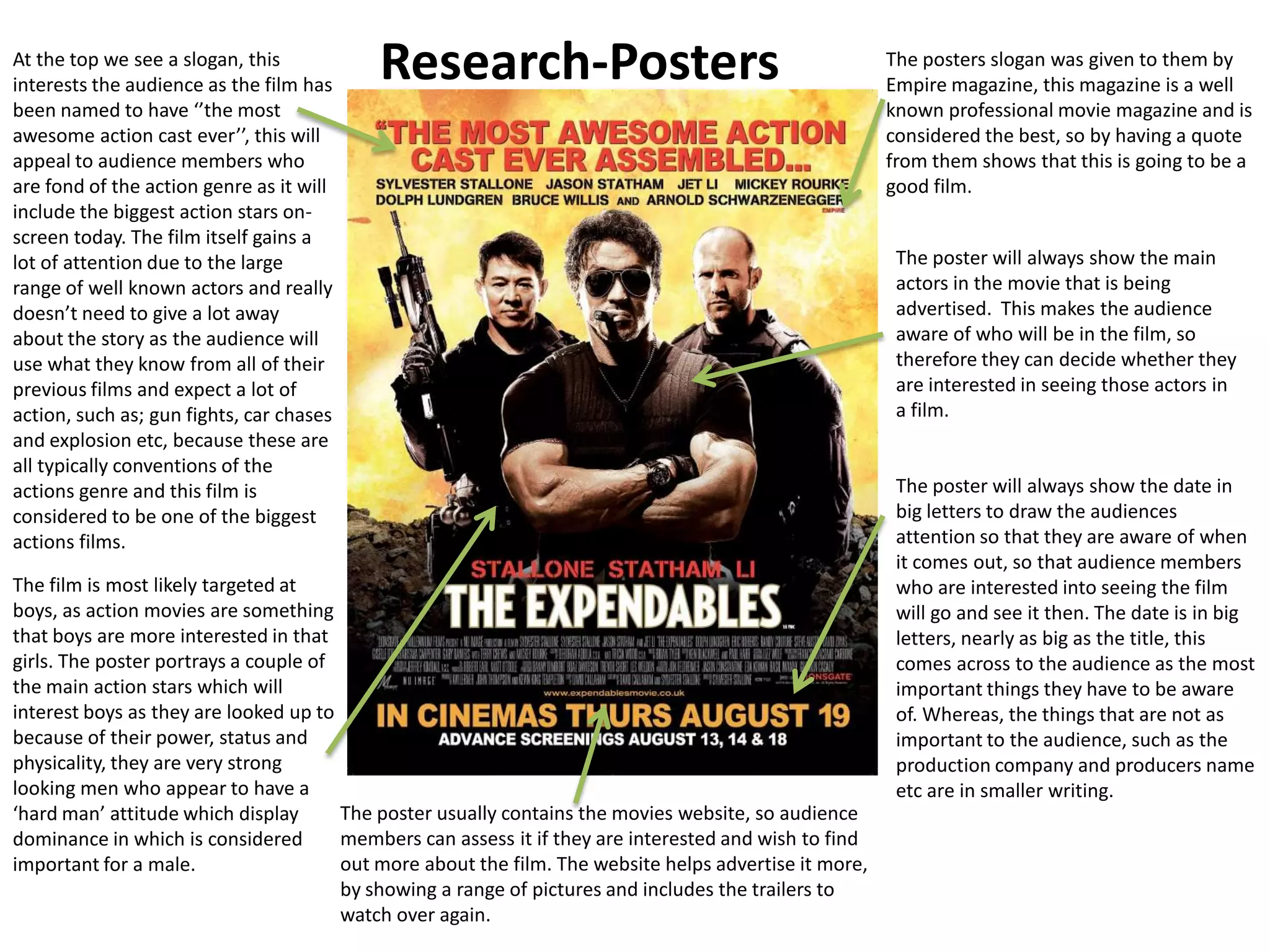 The poster for the action film advertises the large cast of well-known action stars to appeal to fans of the genre who expect conventions like fights, chases and explosions. It includes a positive quote from Empire magazine to indicate it will be a good film. The poster shows the main actors and release date to draw audience attention and allow people to decide if they want to see those actors or mark their calendars. The dark, serious-looking poster for Salt establishes Angelina Jolie's character is important but mysterious, conveying the film will be serious and leaving the audience wanting to learn who her character Salt is when it releases in the summer.