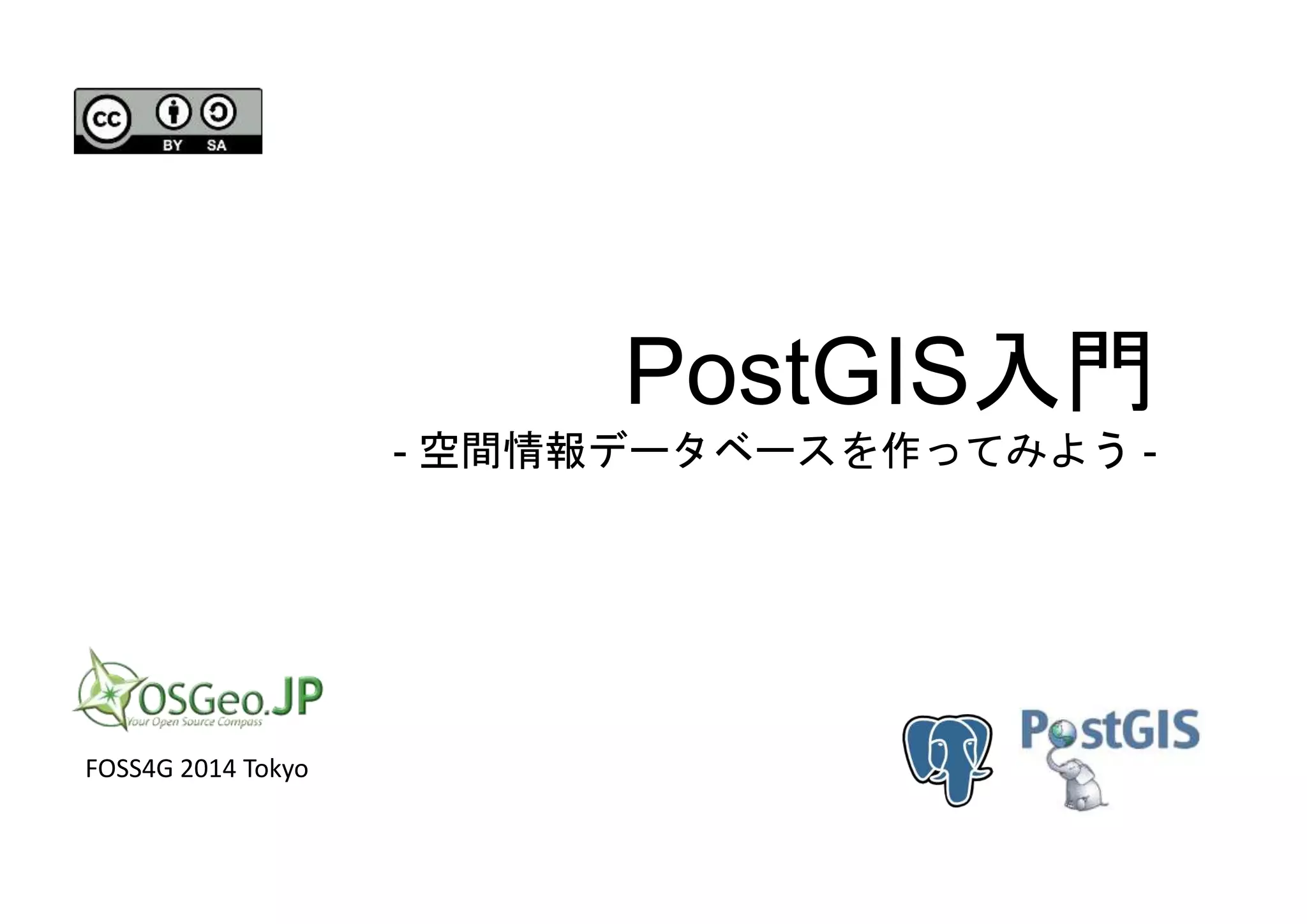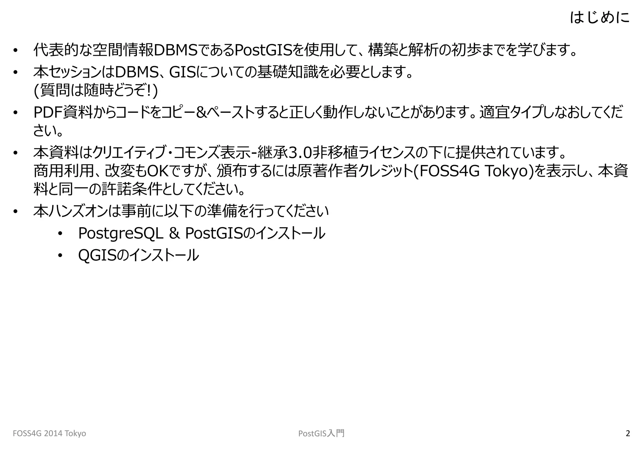 PostGIS Handson | FOSS4G Tokyo 2014 1. 2. • 代表的な空間情報DBMSであるPostGISを使用して、構築と解析の初歩までを学びます。