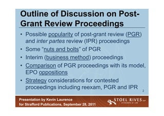 This document discusses post-grant review proceedings under the America Invents Act, including: