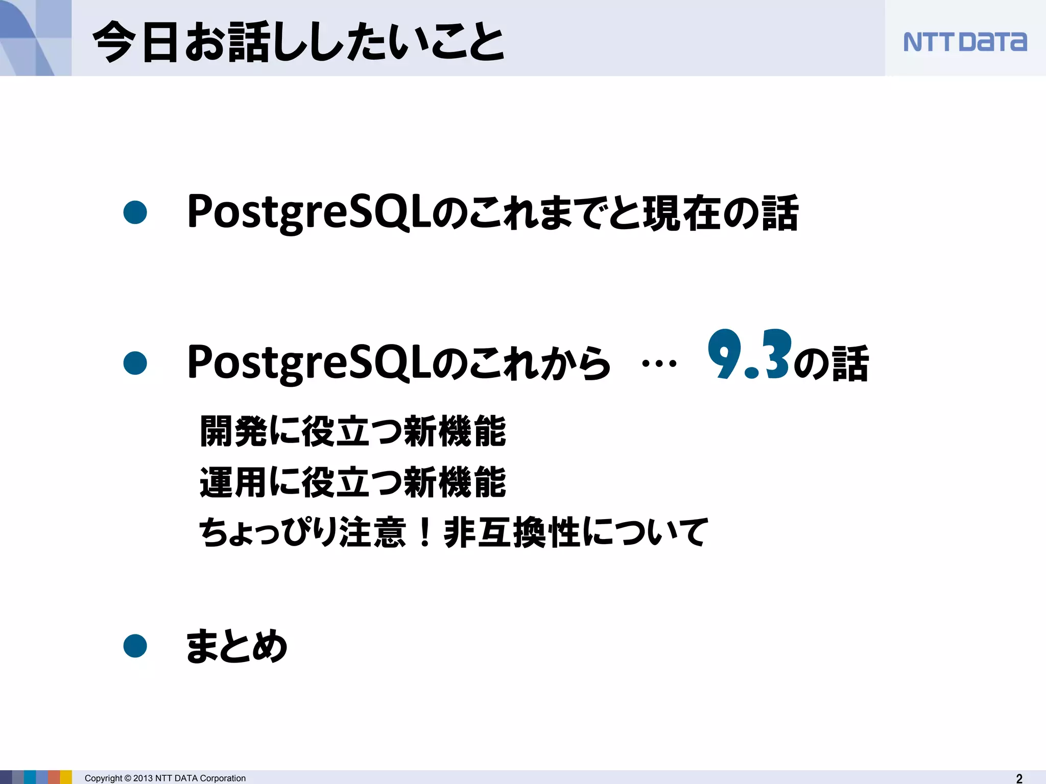 NTT DATA Corporation PostgreSQLの歩み~8系から 2011 2012 2013 9.0 9.1 9.2 同期レプリケーション UNLOGGED TABLE SQL/MED カスケードレプリケーション IndexOnlyScan スケーラビリティ向上 2010 非同期レプリケーション ホットスタンバイ SQL構文強化 8.0 Windows対応 PITR 機能 テーブルスペース 2005 9.3 Viewの改良 postgresql_fdw Fast promote ..etc 開発中 PostgreSQL最新版は9.2.4(2013/4/4 リリース) 8.4 Window関数・再帰クエリ VACUUM用メモリ自動管理 他DBMS互換性向上 8.3 HOT: 更新性能向上 VACUUM自動化 全文テキスト検索 2008 2009 8.2 pgcrypto hstore 20078.1 2009 autovacuum ロール