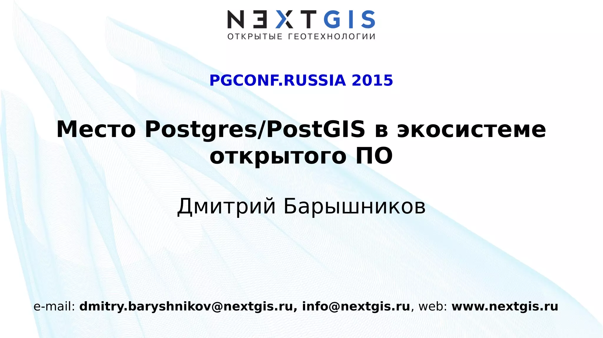 Документ представляет собой презентацию о PostGIS, расширении для PostgreSQL, предназначенном для работы с географическими данными. Основное внимание уделяется функциям PostGIS, таким как управление геометриями и растрами, а также стандартам и протоколам, используемым в системе. Приведены примеры использования и информация о библиотеке GDAL и сообществе, поддерживающем проект.