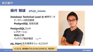 押さえておきたい、PostgreSQL 13 の新機能!! (PostgreSQL Conference Japan 2020講演資料) 2020年11月13日 NTTデータ / NTT DATA 技術開発本部 先進コンピューティング技術センタ 藤井 雅雄