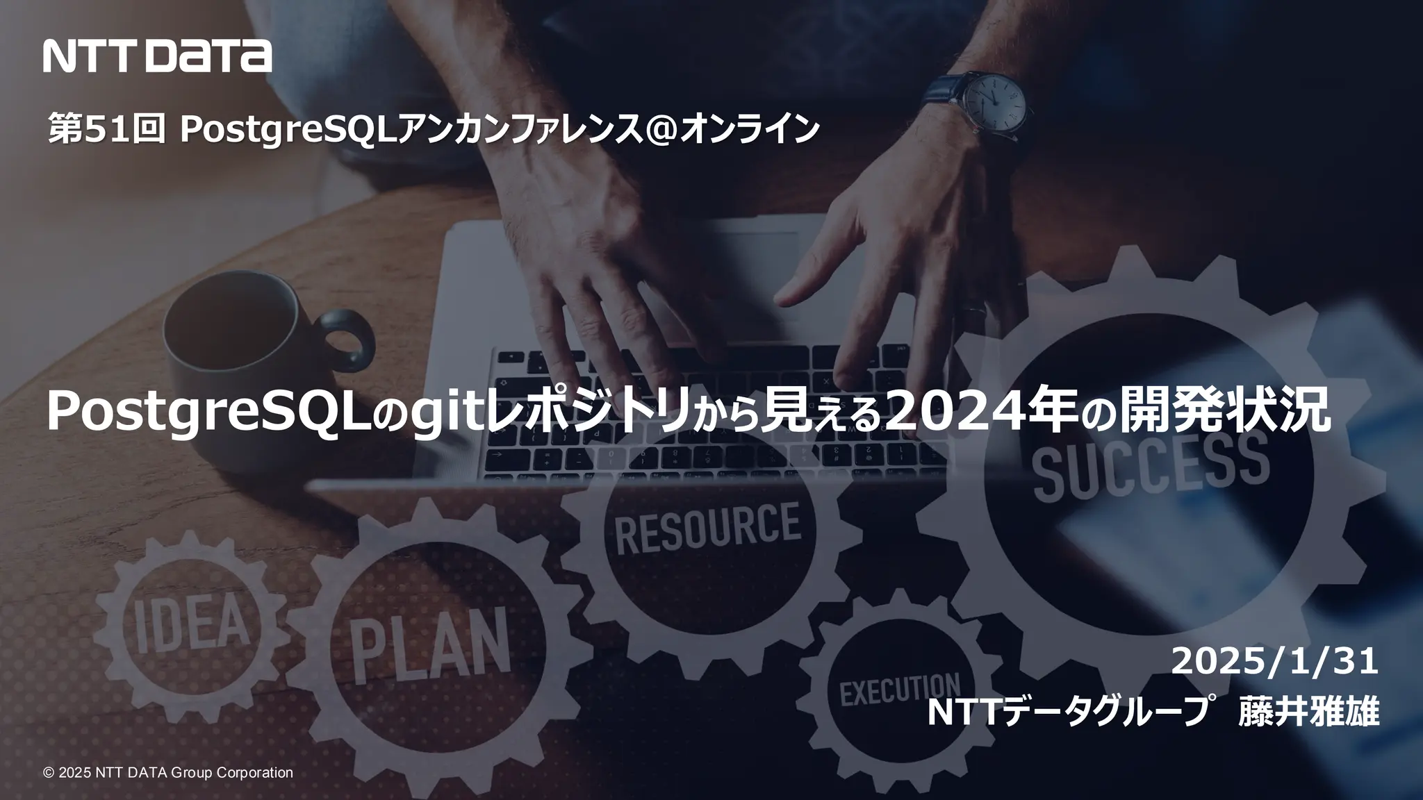 PostgreSQLのgitレポジトリから見える2024年の開発状況 (第51回 PostgreSQLアンカンファレンス@オンライン 発表資料) 2025年1月31日(金) NTTデータグループ Innovation技術部 藤井 雅雄