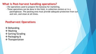 Post-harvest handling operations for bananas include dehanding, washing, sorting, grading, packaging, and transportation. The key operations are dehanding which removes the banana hands from the stalk, washing to remove debris and microorganisms, sorting and grading to separate fruits by quality, and packaging in containers like plastic crates for transport. Proper post-harvest handling is important to prepare bananas for marketing and distribution while maintaining quality.