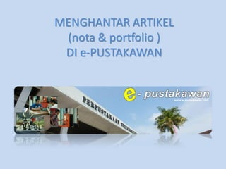 Dokumen ini memberikan arahan tentang cara menghantar artikel, nota, dan portfolio menggunakan e-pustakawan. Ia menerangkan langkah-langkah untuk login, mencipta post, memasukkan nota dan imej, serta mengkategorikan dan menerbitkan nota. Setelah langkah-langkah selesai, nota akan berjaya dihantar ke e-pustakawan.