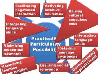 The document discusses post-method pedagogy in language teaching. It emerged as a response to the limitations of conventional teaching methods. Post-method pedagogy aims to facilitate teacher autonomy and development of teachers' own context-sensitive theories. It emphasizes practical knowledge over rigid application of methods. Key aspects include focusing on the particular contexts and experiences of teachers and learners, and providing a framework to help teachers strategically integrate methods in a principled way based on their own practical understanding.