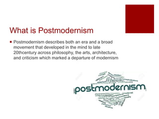 Postmodernism describes both an era and movement since the late 20th century marked by a departure from modernism across various fields. The document discusses how a documentary can take a postmodern approach even if it aims for realism by not exposing the filmmaking process. While the documentary does not show equipment or ask questions before interviews, it constructs reality through choices like using lapel mics that remove ambient sound and lighting equipment that adds highlights. During editing, footage and questions are chosen to shape a narrative from hardship to reward in the industry. [/SUMMARY]