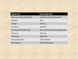 This document provides an overview of postmodernism across various artistic disciplines from the 1960s onward. It summarizes some of the key characteristics and qualities of postmodernist works, including extreme self-reflexivity, the breakdown of boundaries between high and low cultural forms, a questioning of grand narratives, and a focus on visuality, simulacra, and temporal experimentation. Various postmodern artists and artworks are referenced as examples that demonstrate these postmodern concepts and traits.