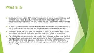 Postmodernism emerged in the late 20th century as a departure from modernism. It is characterized by skepticism of culture and history and a rejection of the idea that any media or text has greater value than another. Postmodernism reflects society's feelings of alienation and uncertainty about identity. Theorists argue that economic and technological changes, like television and the internet, have led to a "three minute culture" and a society dominated by images and spectacle. Postmodern art is hybrid and samples different styles and levels of culture to blur hierarchies of taste.