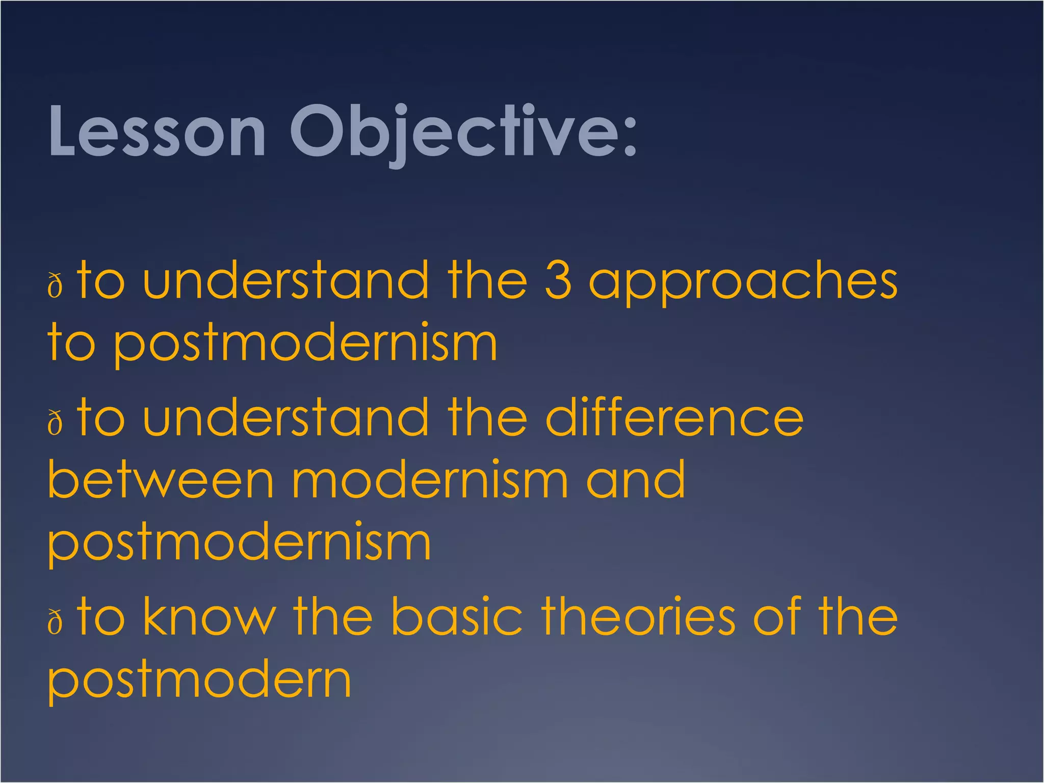 This document discusses postmodernism from three approaches: historical, theoretical, and stylistic. Historically, postmodernism reacted against modernism and its ideas of progress, objectivity, and certainty. Theoretically, key theorists like Lyotard, Baudrillard, and Jameson analyzed postmodernism's rejection of grand narratives, hyperreality, and lack of depth. Stylistically, postmodern texts are characterized by concepts like generic blurring, intertextuality, playfulness, and uncertainty. To determine if a text is postmodern, the document proposes combining all three approaches, focusing on stylistic elements informed by historical and theoretical perspectives.