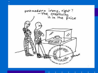 Postmodernism is a movement that emerged after modernism, characterized by deconstruction, commodification of knowledge, the influence of media, alienation, simulation, and loss of faith. It reflects a consolidated capitalist society with the decline of overarching narratives and the rise of copies and derivatives over original works, paving the way for other "post" movements.