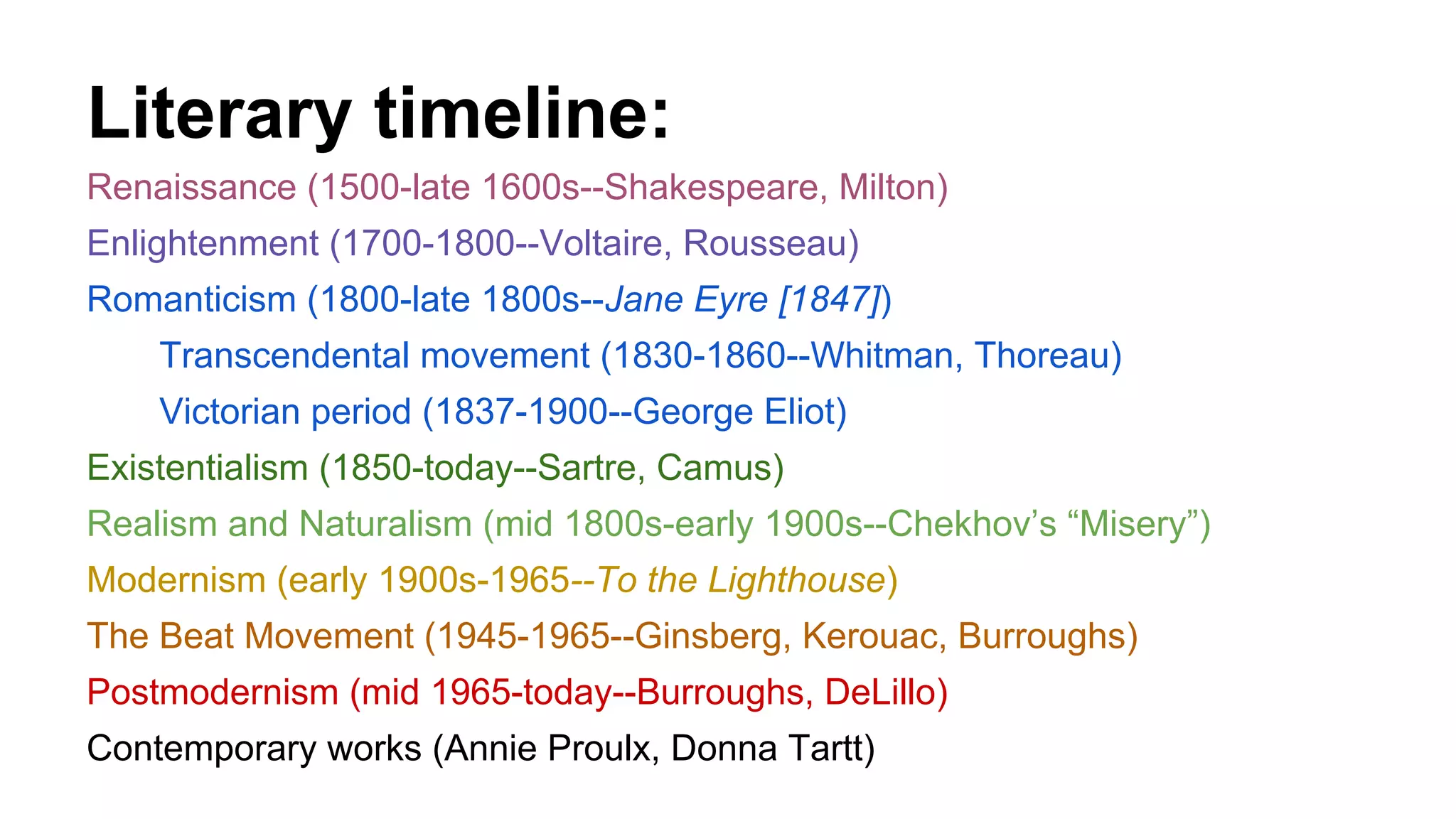 This document provides an overview of postmodernism and its relationship to modernism. It discusses key characteristics of postmodernism such as a rejection of grand narratives, irony, self-reflexivity, and mixing of styles. The Beat movement is presented as a precursor to postmodernism through its dissent from conformity and privileging of diversity. Elements of postmodern literature are defined, including pastiche, metafiction, and intertextuality. Potential problems with postmodernism are noted around a lack of new ideas and focus on dystopia without solutions. The document traces literary periods and concludes by discussing the current post-postmodern or metamodern era.