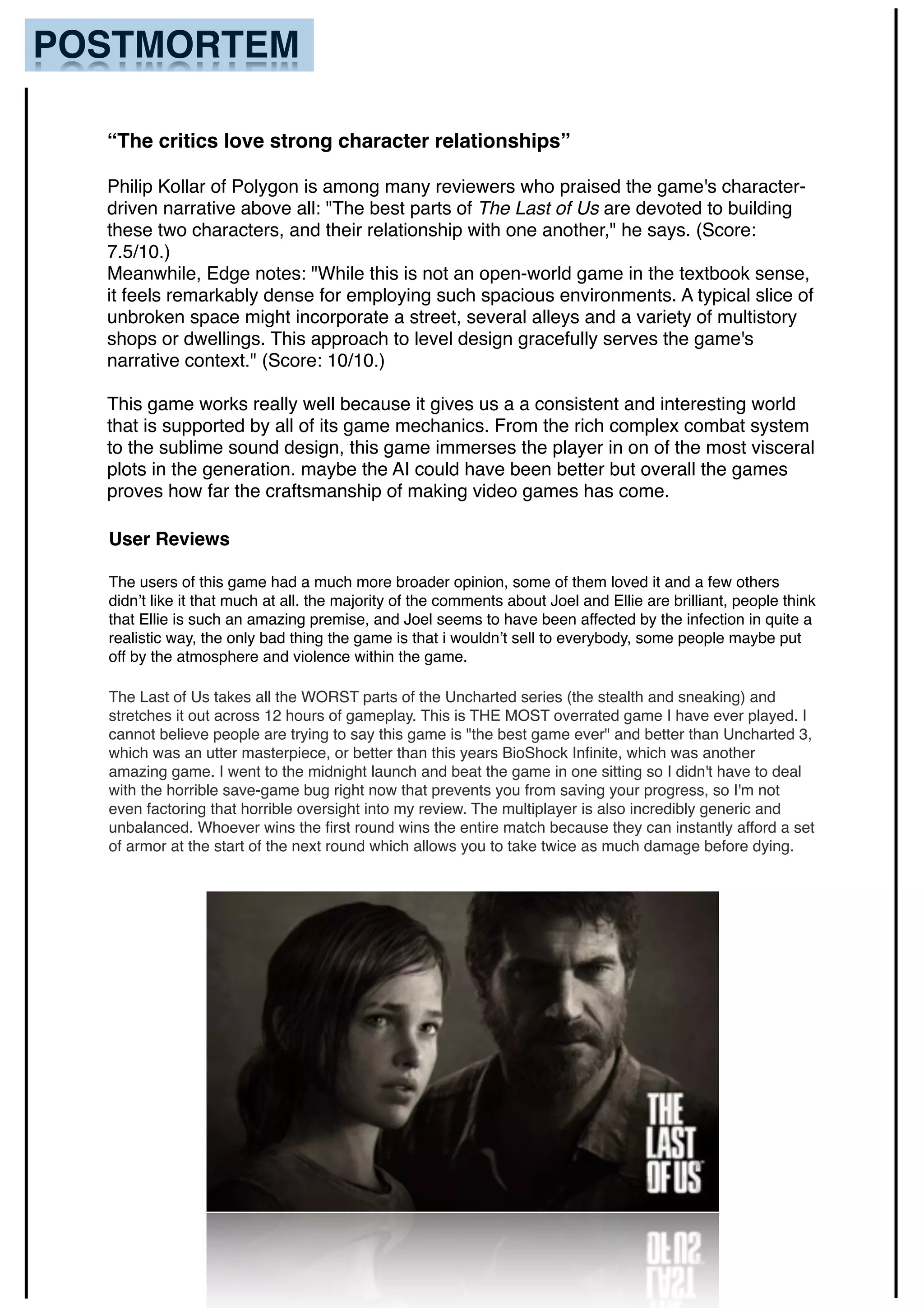 User reviews of The Last of Us were mixed, with some praising the realistic characters of Joel and Ellie but others finding the gameplay repetitive or violence off-putting. Critics praised the character development and relationship between Joel and Ellie, calling it the game's strongest element, but some felt the gameplay was overly generic or the multiplayer unbalanced. Overall reviews commended how the game's mechanics and design immersed players in a rich, complex world supporting a visceral narrative, though room for improved AI was noted.
