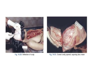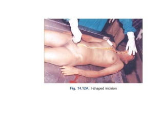 This document provides information on performing medicolegal autopsies. It discusses the different types of autopsies including clinical, medicolegal, and anatomical autopsies. For medicolegal autopsies, the key steps are the external examination to document any injuries or identifying marks, followed by the internal examination which involves dissecting the cranial, thoracic, and abdominal cavities to examine the organs. Specific procedures are described for examining cases involving poisoning, hanging, firearms injuries, drowning, burns, and more. The document also covers performing autopsies on fetuses and infants to determine the cause of death, whether the infant was born alive or stillborn, and the gestational age.