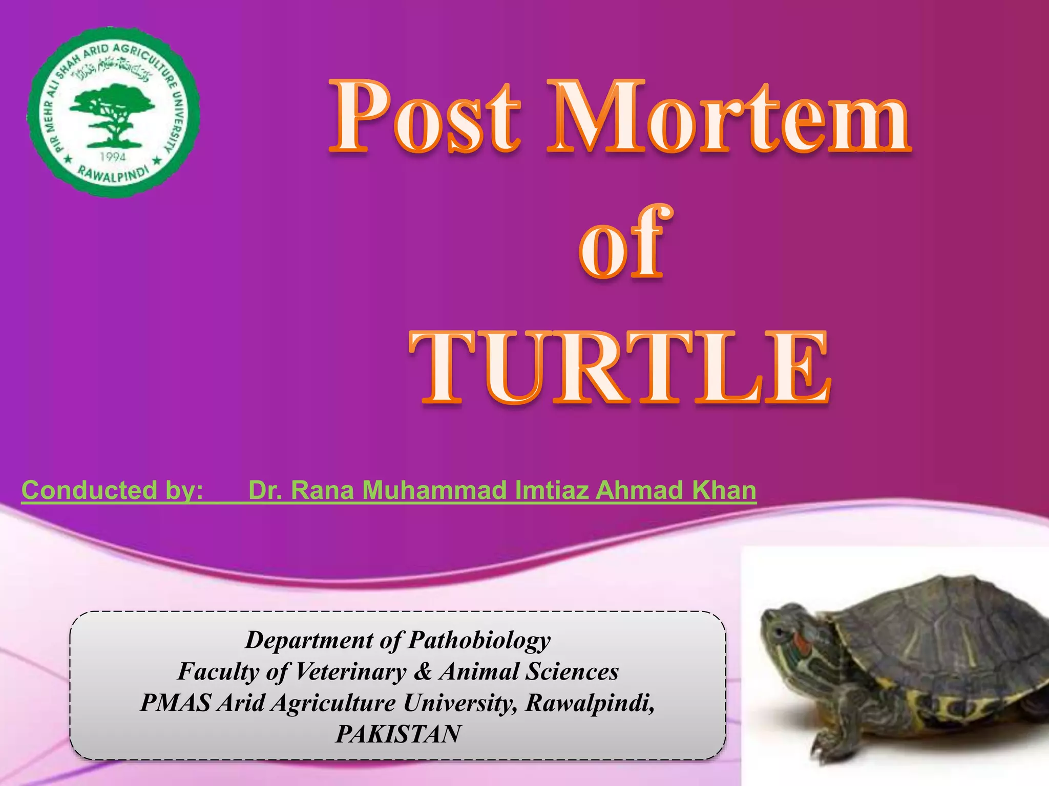 This document summarizes the findings of a post-mortem examination on a turtle. Key findings include:
