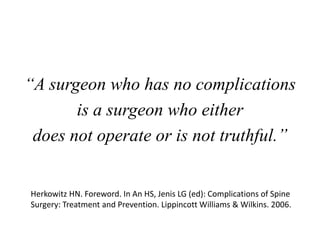 The document discusses the incidence, risk factors, prevention, diagnosis, and treatment of postoperative spinal infections. It emphasizes the importance of preoperative antibiotics and proper surgical techniques to minimize infection rates, as well as the necessity for careful diagnosis and treatment strategies based on infection severity. The findings are based on a systematic review of multiple studies, highlighting the complexity of managing these infections in spinal surgery.