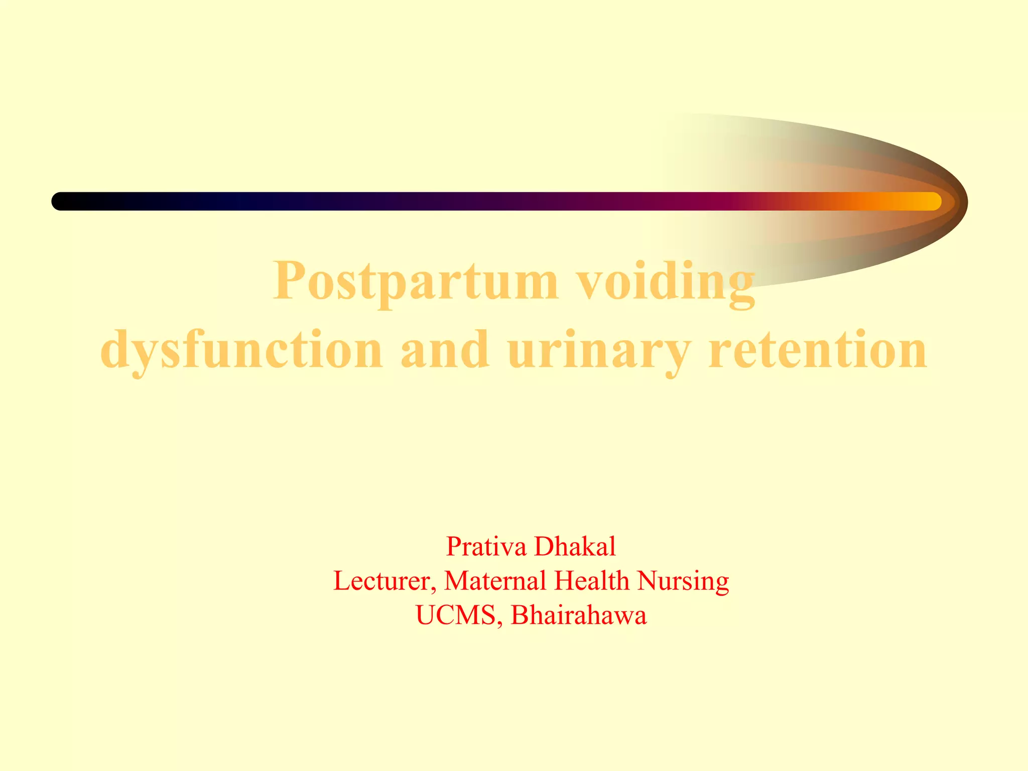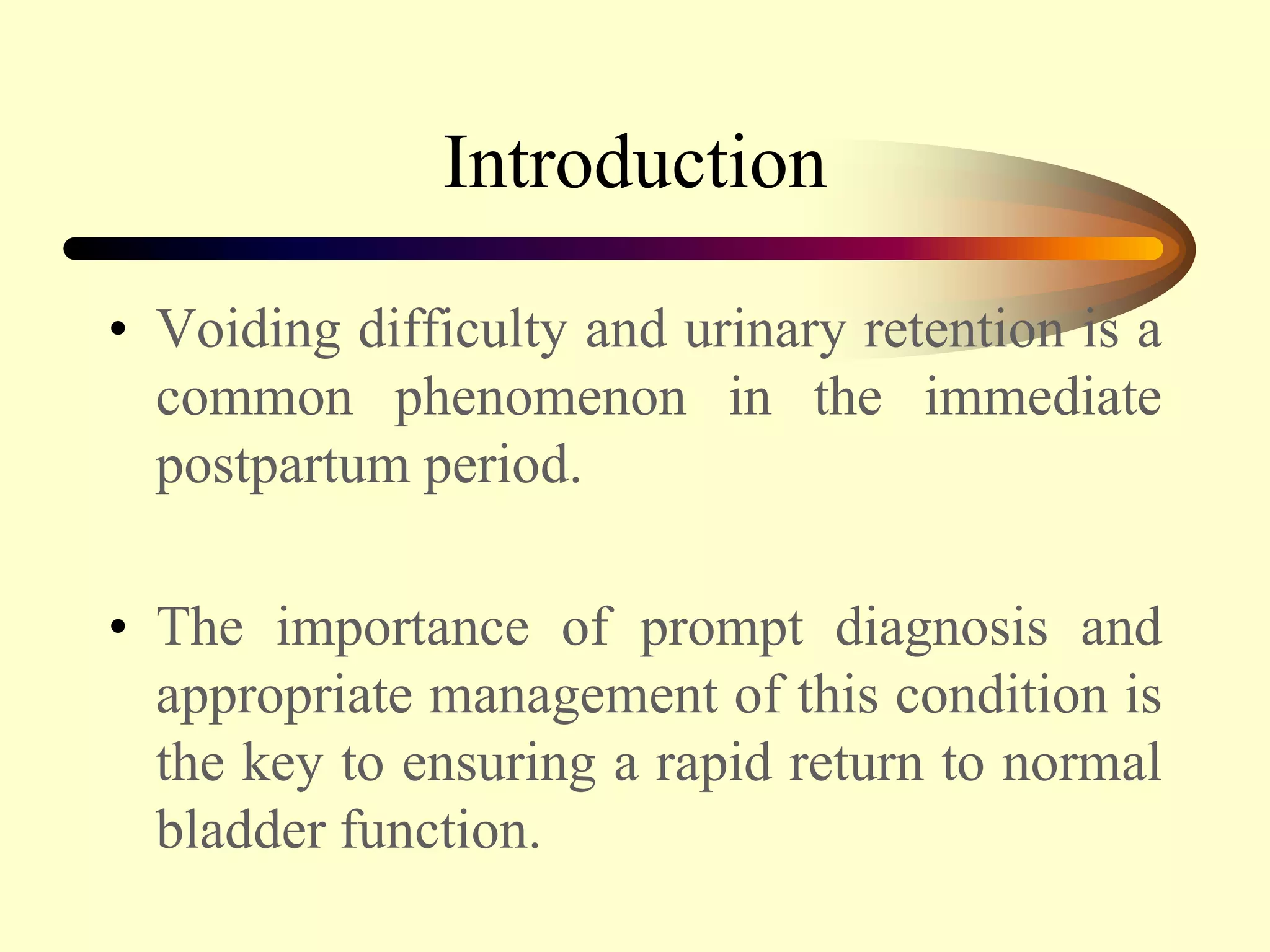 Postpartum voiding dysfunction and urinary retention is common after delivery and can lead to complications if not properly managed. Risk factors include instrumental delivery, epidural analgesia, prolonged labor, and large birth weight. Pathophysiology may involve nerve damage during delivery and physiological changes causing a hypotonic bladder. Management includes encouraging voiding every 2-3 hours during labor, offering an indwelling catheter for 6 hours after an epidural, and measuring voided volumes and post-void residuals to identify retention. Treatment involves catheterization, pelvic floor exercises, analgesia, and clean intermittent self-catheterization if needed.