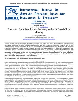 This document discusses an optimized report recovery system under LT-based cloud memory, focusing on improving document recovery delay in distributed storage. It emphasizes the use of fountain codes, Luby transformation (LT) codes, and presents a novel approach for multi-cloud storage that balances recovery time and successful decoding. The proposed system, LT Cloud, aims to enhance data repair efficiency while providing fault tolerance and minimizing bandwidth during recovery processes.