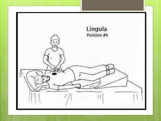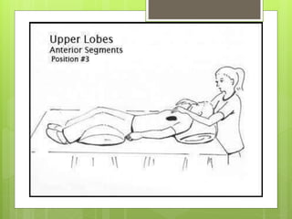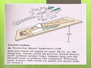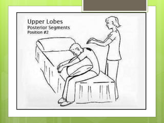 Postural drainage is a technique used to clear secretions from the lungs by placing patients in positions that utilize gravity. It involves tilting or propping patients at angles to drain secretions from the lungs into the central airways. Manual techniques like percussion, vibration, and shaking are used alongside positioning to loosen secretions and enhance their removal. Postural drainage is effective for conditions with increased mucus production and is commonly used for patients who have difficulty coughing up secretions due to illness, surgery, or prolonged bed rest.