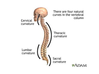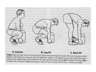 This document discusses posture and factors that affect it. It defines good posture as optimal muscular balance and efficiency. Posture changes throughout life and with activity. The spine curves allow strength and mobility. Maintaining upright standing, sitting, and lifting postures protects the back, while improper forms can strain muscles and ligaments over time. Small postural sways help prevent fatigue and aid circulation while balancing.