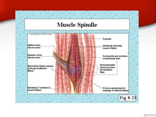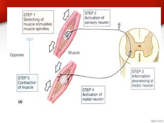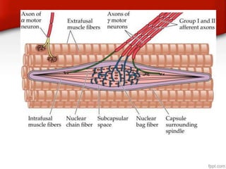 2) It describes how muscle tone, regulated by gamma motor neurons, and stretch reflexes originating from muscle spindles work together to maintain posture through continuous low-level muscle contraction.