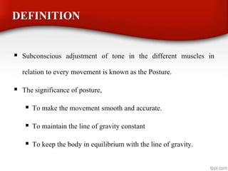 1) The document discusses posture and equilibrium, defining posture as the subconscious adjustment of muscle tone to maintain balance and the body's relationship to gravity.
