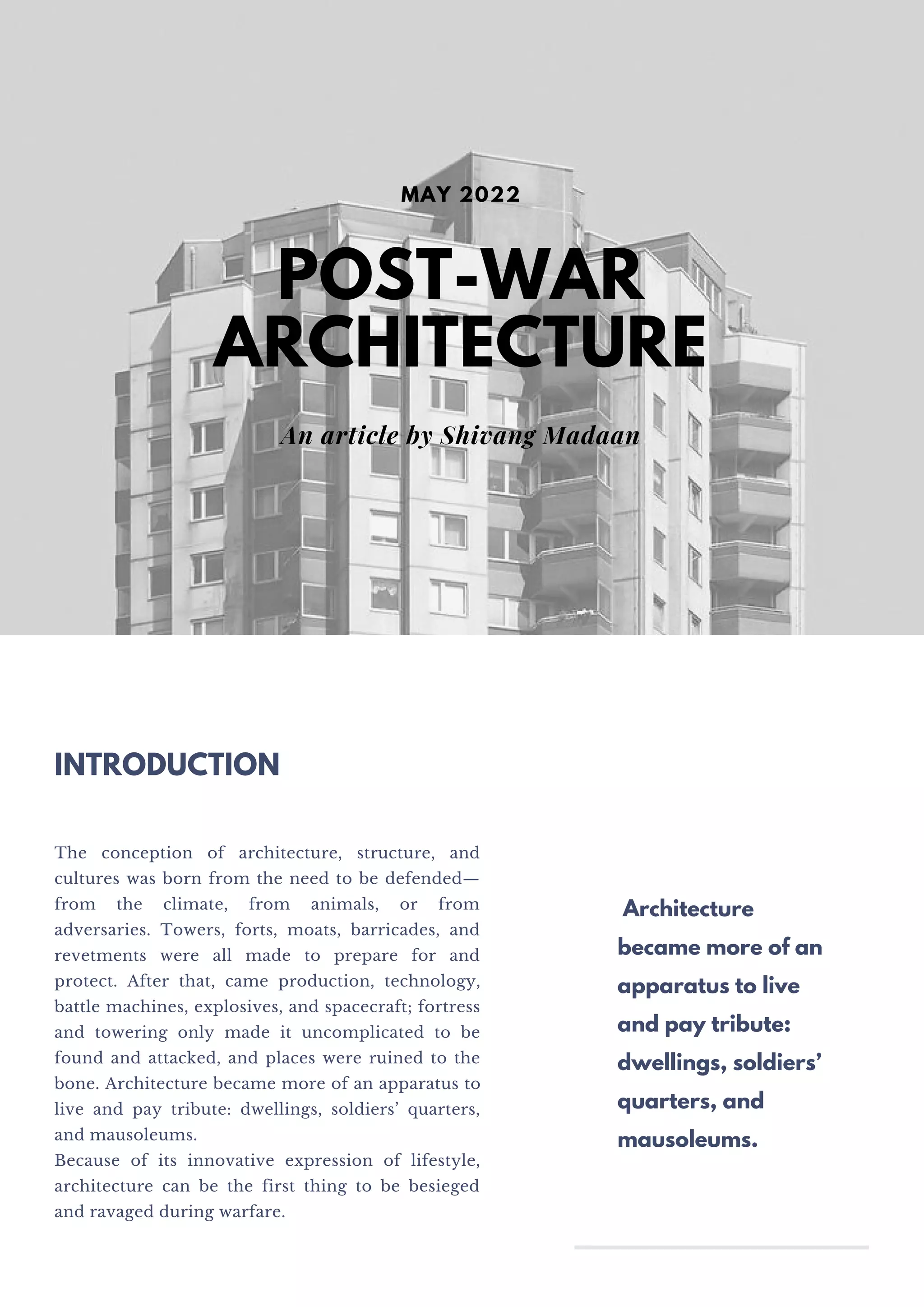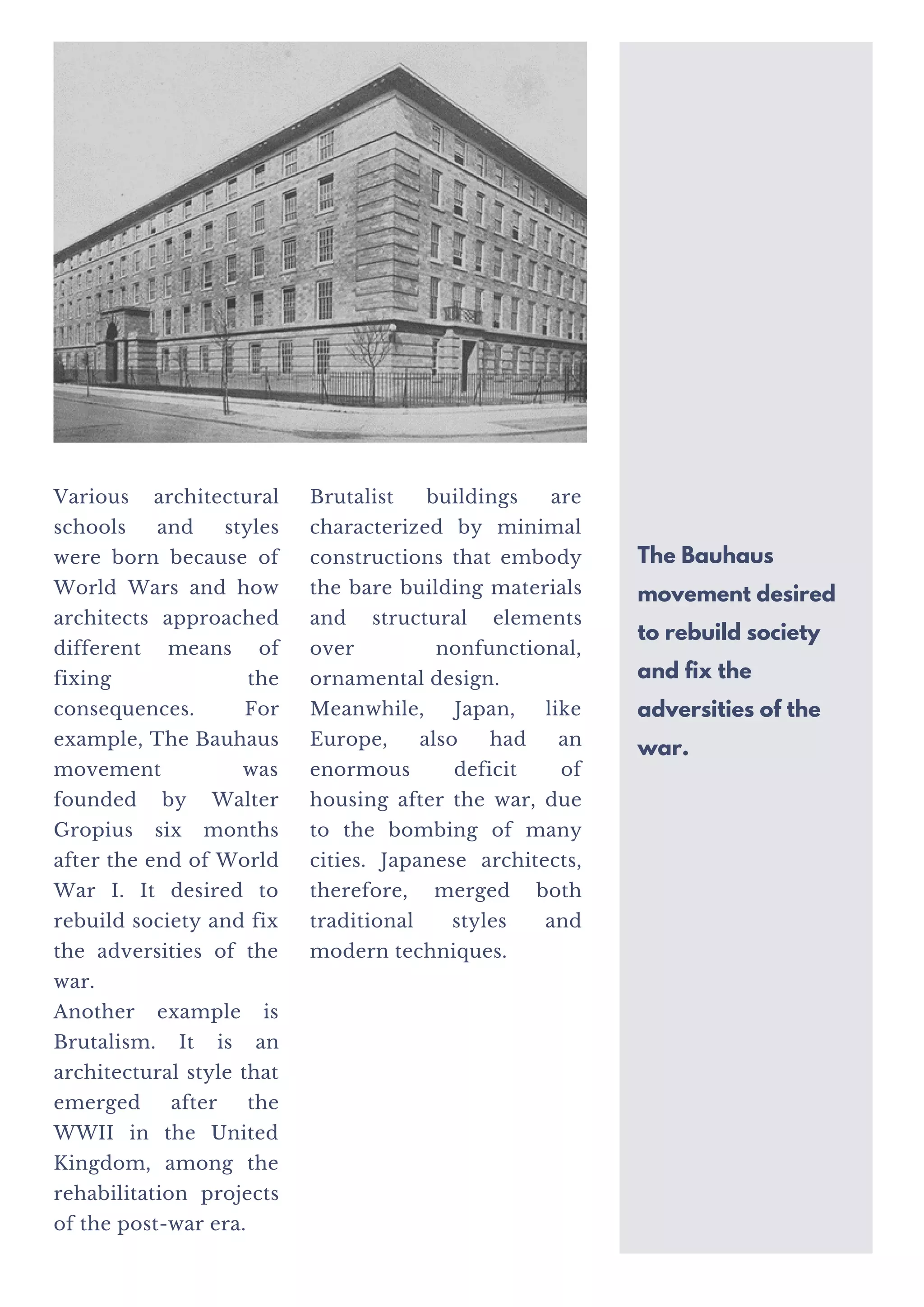 War significantly impacts architecture and urban planning. Post-war, architecture focused more on practical living spaces like dwellings and quarters rather than defensive structures. Various architectural styles also emerged from rebuilding efforts, such as the Bauhaus movement which aimed to rebuild society after WWI and Brutalism which used basic concrete construction for UK post-WWII housing projects. Extreme changes to spaces and environments caused by war can disrupt societies.