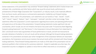 The document is an investor presentation for Potash Ridge Corporation outlining its two potash sulfate (SOP) fertilizer projects - Valleyfield in Quebec and Blawn Mountain in Utah. It notes that SOP demand exceeds supply in North America and these projects are strategically located to serve key crops. Valleyfield will be the first SOP producer on the east coast using a proven process. Blawn Mountain has 45+ years of reserves and will be the lowest cost producer in North America. The presentation highlights the projects, management team, and near term catalysts in an effort to secure financing and bring the projects online to capture opportunities in the growing North American SOP market.