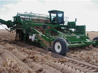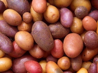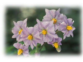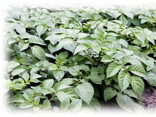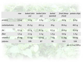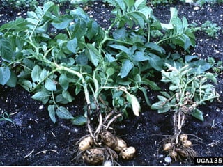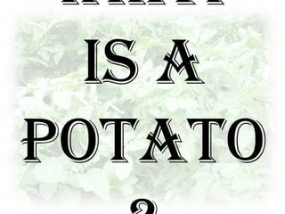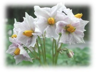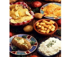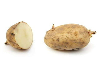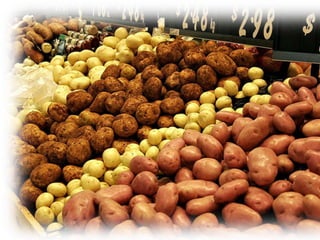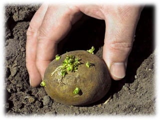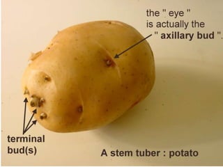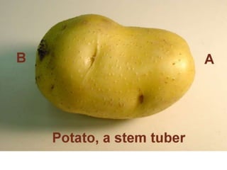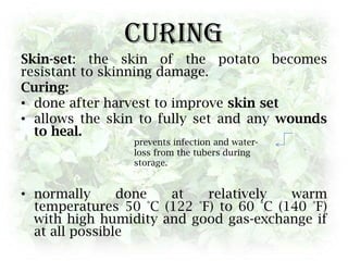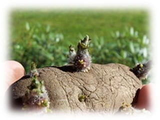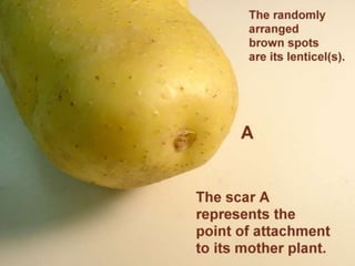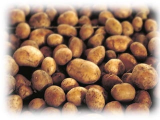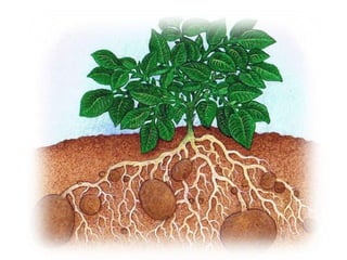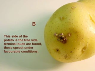 Potatoes are a tuber crop grown worldwide for food. A potato plant develops from an underground tuber that has eyes from which sprouts and roots grow. Potatoes are botanically classified as a root vegetable but are actually modified stems called tubers that grow underground. The tubers are planted, they sprout, photosynthesis occurs to develop the plant above ground while also bulking the underground tubers, then the tubers are harvested. Potatoes require cool temperatures, well-drained soil rich in organic matter, and are cultivated through hilling which piles additional soil around the base of the plant as it grows.