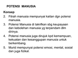 Dokumen ini membincangkan potensi manusia yang merangkumi kemampuan terpendam dalam pelbagai aspek seperti emosi, mental, sosial, dan fizikal. Ia menerangkan pelbagai jenis kecerdasan berdasarkan teori Howard Gardner, termasuk kecerdasan bahasa, logik matematik, spatial, dan muzik. Setiap individu mempunyai kecerdasan unik yang perlu diperkembangkan untuk menghasilkan idea dan menyelesaikan masalah.