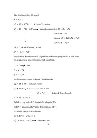 Dokumen ini membahas tentang potensial termodinamika, yaitu fungsi Helmholtz dan Gibbs, serta aplikasinya dalam hukum termodinamika. Selain itu, dijelaskan tentang keseimbangan sistem termodinamika, relasi Maxwell, dan persamaan Clausius-Clapeyron sesuai dengan kondisi suhu dan tekanan. Terakhir, dokumen menyoroti hukum ketiga termodinamika yang menyatakan bahwa entropi pada suhu nol mutlak adalah nol.