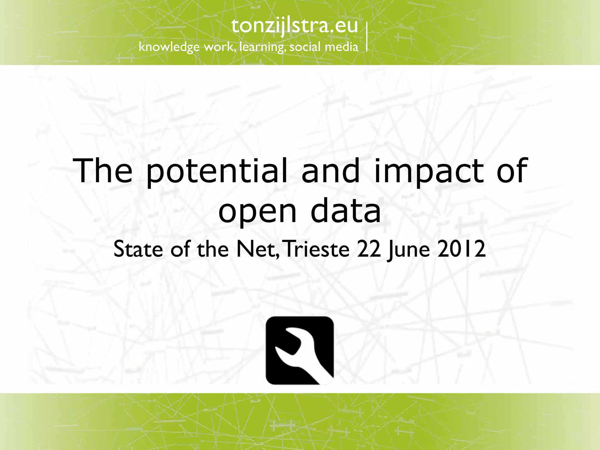 This document summarizes a presentation on open data given on June 22, 2012 in Trieste, Italy. It discusses key principles of open data including being complete, primary, timely, accessible, machine readable, non-discriminatory, using open standards and licenses. It outlines relevant EU directives and notes the potential economic impact of open data in billions of Euros per year. It identifies barriers like fragmentation and lack of use and proposes solutions like networks, community building, and looking beyond apps to uses like business intelligence, ambient displays, physical products, policy implementation and quality of services.