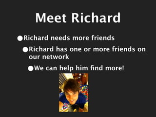 The document discusses how Richard Schneeman can find friends through a network by leveraging mutual friends and friends of friends. It details the backend mechanisms using caching systems like Memcache and Redis to improve the speed of finding potential friends by storing and retrieving user data efficiently. Additionally, it explains Ruby array manipulations for refining potential friend suggestions by excluding current friends and already ignored connections.
